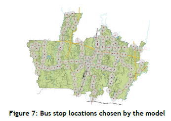 2. Land-use restrictions: Some regions were excluded from the serviceable area owing to land-use patterns that were unsuitable for transit infrastructure development. For example, large tracts of land used for golf courses or low-density residential areas posed significant barriers to integrating bus stops effectively.