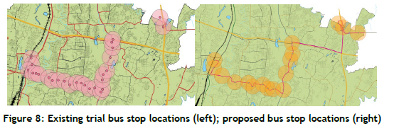 Corridor efficiency. A central recommendation emerging from the study was to reduce the number of stops on specific trial corridors to enhance overall efficiency. By strategically placing bus stops, the optimised network significantly reduced transit times for users, improving travel time efficiency. Fewer but strategically located stops allowed buses to maintain a smoother flow, avoiding frequent deceleration and acceleration, which would not only shorten travel times but also enhance passenger comfort.