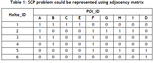 The set cover problem (SCP) is an optimisation method that is used to determine the smallest combination of facility locations to meet demand efficiently [20]. In public transportation, SCP is applied to identify bus stop locations by considering cost efficiency by minimising the number of stops [21] while keeping service adequacy by ensuring that all demand points are covered [22], and maintaining user accessibility by keeping the distance to bus stops within acceptable limits [23]. SCP is represented as a binary matrix, in which rows indicate demand points and columns represent candidate locations. Exact methods such as linear programming and branch-and-bound are often employed to find optimal solutions. However, heuristic algorithms, including genetic algorithms and simulated annealing, are also commonly used to solve large-scale problems [22],[23]. SCP has been widely applied in facility location and transportation planning, but its classification as an NP-hard problem presents difficulties when needing to solve large datasets efficiently [24].