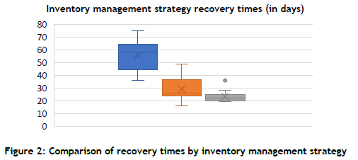 The box plot in Figure 2 shows that companies using safety stock and strategic buffering strategies experienced significantly shorter recovery times post-disruption compared with those using a JIT strategy. The median recovery time for companies with strategic buffering was 22 days, compared with 58.5 days for those using JIT.