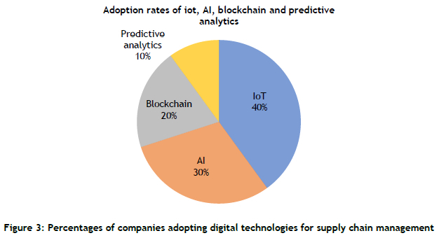 These adoption rates reflect the growing integration of advanced technologies in the industry, particularly with the rise of the loT and AI, which are used to enhance operational efficiency, real-time data processing, and predictive maintenance. Blockchain, while less often adopted, is increasingly recognised for its potential to strengthen supply chain security and transparency, while predictive analytics is crucial for anticipating and mitigating supply chain disruptions.