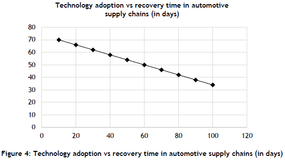 The scatter plot of technology adoption rates versus recovery times revealed a strong negative correlation (r = -0.75). This indicated that recovery times significantly decreased as the technology adoption level increased. For example, suppliers that had integrated the IoT and predictive analytics into their operations experienced average recovery times of 34 days, compared with 75 days for those with minimal digital adoption. The trend line derived from the data analysis supported this relationship further, showing a consistent decline in recovery times with higher levels of technology adoption.
