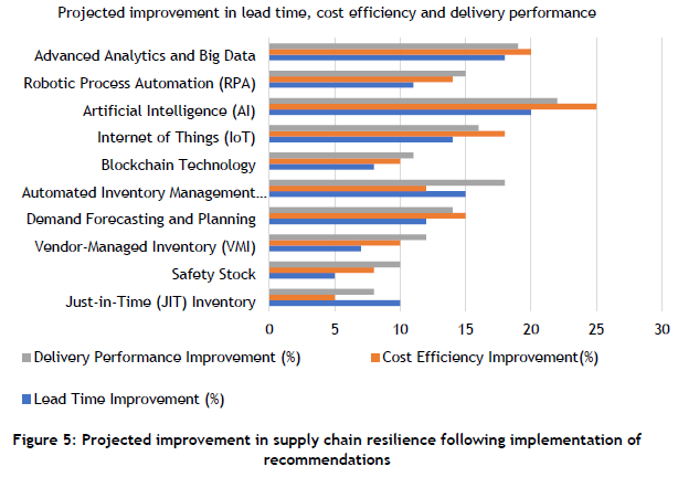 As shown in Figure 5, the projected outcomes suggest significant improvements in key supply chain performance metrics, including a 20% reduction in lead times, a 15% increase in cost efficiency, and a 25% enhancement in delivery performance following implementation of the recommended strategies. The results of this study provide clear evidence that effective inventory management strategies, particularly those that incorporate digital technologies, play a critical role in enhancing the resilience of automotive supply chains.
