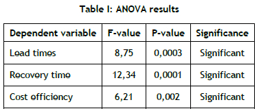 The ANOVA results indicated a significant difference in lead times in the different inventory management strategies, with an F-value of 8.75 and a P-value of 0.0003 - well below the standard significance level of 0.05. This suggests that the choice of inventory management strategy had a significant impact on lead times. Recovery times also differed significantly between the strategies, with the highest F-value of 12.34 and a P-value of 0.0001, indicating that some strategies were substantially more effective at reducing recovery times after disruptions. The ANOVA results for cost efficiency revealed significant differences among the strategies, with an F-value of 6.21 and a P-value of 0.002, signifying that specific strategies led to better cost efficiency.