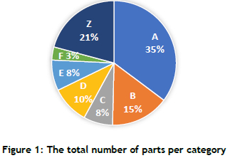 The analysis of KPIs in Figure 1 highlights the scale of inefficiencies in the current system. According to the system classifications, the largest category was A parts, representing 35% of the total, followed by Z parts at 21%, with the combined EFYZ categories accounting for 32% of all items. (Please note that the Y category accounted for only 0.007% of all parts, and so was excluded from the remainder of the study.)