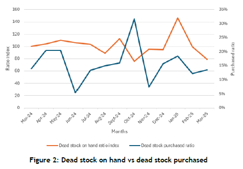 The analysis also highlighted purchasing practices that negatively affected profitability. Even though large volumes of dead stock were already on hand, additional EFYZ parts continued to be ordered monthly. This is illustrated in Figure 2, where a ratio index was calculated to represent the dead stock on hand. A ratio index compares the value of a variable in each period to a reference (base) period, expressed as a percentage. It is calculated by dividing the current period value by the base period value and then multiplying the result by 100. Values above 100 indicate an increase relative to the base period, while values below 100 indicate a decrease.