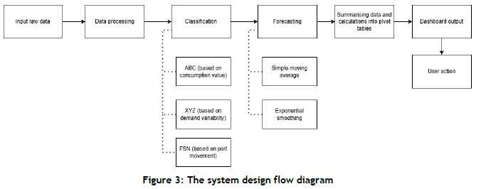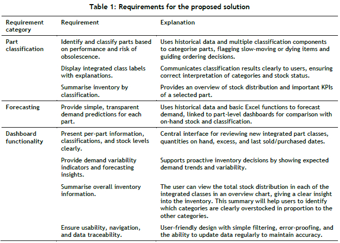 The analysis presented in Section 3.1, combined with the literature reviewed in Section 2, provided the foundation for defining the requirements of the proposed solution. The requirements were subdivided into three subsections of the proposed solution: part classification, forecasting, and dashboard functionality.