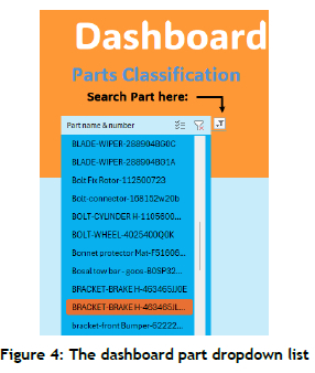 The first step in using the dashboard involves selecting a part to review. Users in the parts department at Dealership X can choose a part by name or number from a dropdown list on the left side of the dashboard, as shown in Figure 4. Only one part can be selected at a time. To simplify the process, a search function is provided, allowing users to locate a part quickly by typing either its name or part number. Each part is listed with both identifiers on a single line, ensuring that parts with the same name but different numbers can be accurately distinguished. This feature streamlines part selection and reduces the time spent navigating lengthy lists.