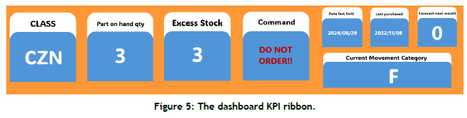 After selecting a part, its integrated classification and KPIs are displayed in the top ribbon of the dashboard, as shown in Figure 5. Critical KPIs, such as "Part on hand qty" and "Excess stock", help users to determine whether to place an order. The excess stock is calculated by comparing the parts' on-hand quantity with the dealership-defined "max potential", highlighting parts that may be overstocked. For parts classified as CZN or CZS, a command such as "Do not order" or "Review excess for ordering" guides the user, directly addressing the root cause of misalignment between part behaviour and ordering practices.