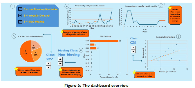 The rest of the dashboard provides a comprehensive and interactive view of inventory and part performance, as shown in Figure 6. Status labels for each letter of a part's integrated class are displayed in step 3 to ensure user-friendliness and help to interpret the classification results. This also supports performance monitoring, as the system can be updated regularly to keep classifications updated. An overview chart (step 4) summarises the number of parts in each integrated class, giving the user a snapshot of the overall inventory distribution. Users can also explore separate category views using navigation buttons to shift between ABC, XYZ, or FSN graphs, allowing focused analysis of demand variability or movement patterns (step 5).