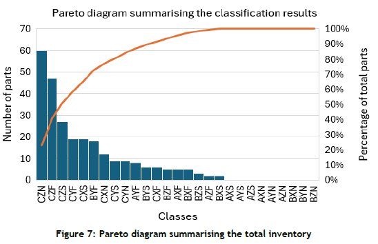 To confirm that the integrated classification method was applied correctly, a Pareto chart was generated showing the total inventory classified under each class (Figure 7). The chart clearly illustrates that the CZN and CZF categories contain the largest number of parts but contribute the least to overall consumption value, consistent with the expected characteristics of these classes. This visual representation provides evidence that the classification framework accurately reflects both part quantity and usage patterns, supporting the validity of the implemented classification method.