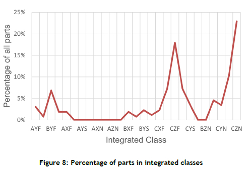 Combining the three dimensions into an integrated classification code (e.g., AXF, BYS, CZN) provides a multi-dimensional view of each part. The proportion of parts in each integrated class is shown in Figures 7 and 8. The largest group is CZN, comprising 23% of parts (60 items), followed by CZF at 18% (47 items). CZN parts are low in consumption value, highly irregular in demand, and largely non-moving, making them high-priority candidates for procurement restrictions. Addressing these parts would be critical to reducing excess stock and optimising inventory management at Dealership X.