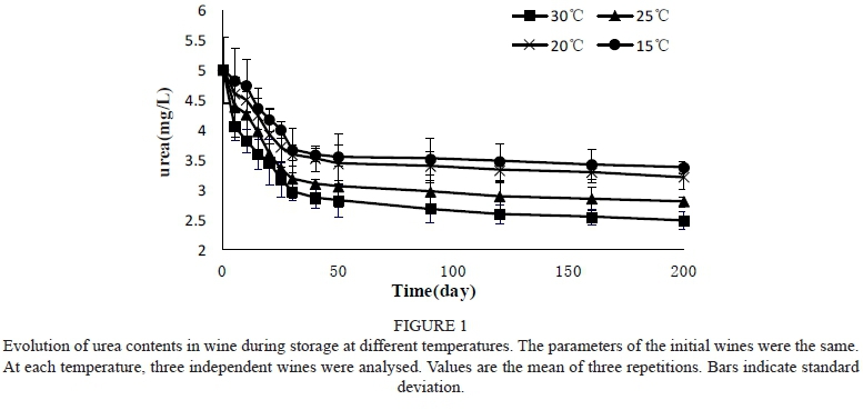 Urea and ethanol can continue to react in wine during storage and thus the concentration of urea can be reduced as a function of time. The first experiment placed wines at 15°C, 20°C, 25°C and 30°C with 5.1 mg/L of urea and followed the change in urea concentration for 200 days of storage (Fig. 1).