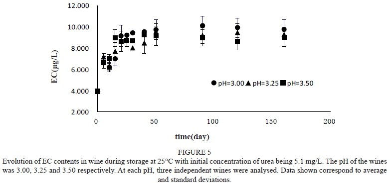 Consistent with previous studies, the concentrations of EC and urea have a directly proportional relationship (Monteiro et al., 1989; Stevens & Ough, 1993; Kodama et al., 1994). Our test followed the change in EC concentration in wines that have different initial concentrations of urea (Fig. 3).