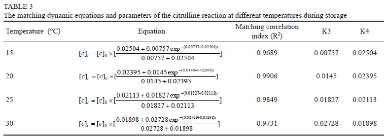 Citrulline is also a major factor that affects the formation of EC in wines. Here, we studied changes in citrulline concentration at different temperatures (Fig. 4). The concentration of citrulline in wine during storage showed a downward trend (Fig. 4). It initially decreased rapidly during storage, and then gradually slowed. This trend is similar to that seen for urea concentration during storage. Using Equation 3 to plot the citrulline concentrations in wines during storage against time, we find the data shown in Table 3.