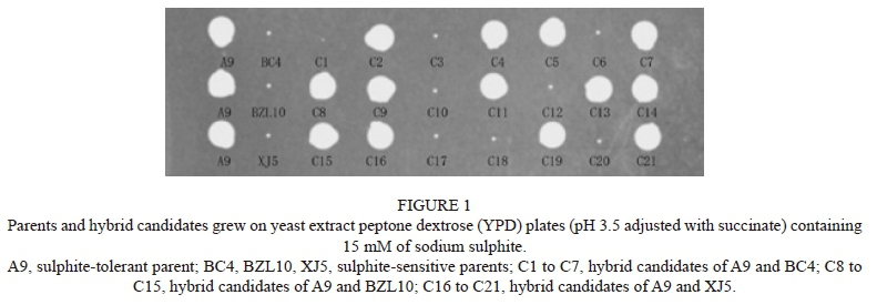 Seven relatively large single colonies were selected from each crossed combination, and a total of 21 colonies were obtained from the three different combinations. Sulphite tolerance tests revealed that seven of the candidate progenies could not grow in a medium containing sulphite. Since sulphite tolerance is dominant (Kutyna et at., 2012), these colonies were not likely to be hybrids (Fig. 1).