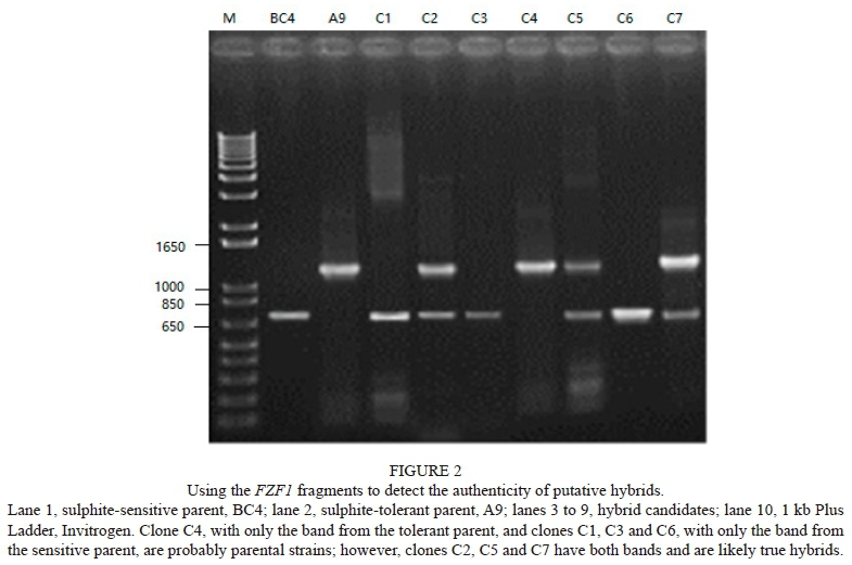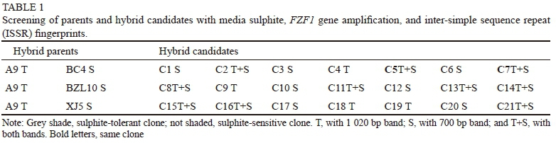 Subsequently, DNA-based molecular biology methods were used to determine which candidates were hybrids. The FZF1 gene is a transcription factor that regulates the expression of the SSU1 sulphite efflux pump and has been shown to be required for the sulphite tolerance of the A9 parent (Zhang et at., 2015). Amplification products of FZF1 gene primers differed between the sulphite-tolerant and sensitive parents. The sulphite-resistant parent A9 produced a band of about 1 020 bp, whilst the sensitive parents all produced a band of about 700 bp. It was concluded that colonies of a single band are not hybrids, whilst those with both parental bands are true hybrids. The results of PCR analysis with FZF1 primers of all 21 candidate progenies showed that there were seven colonies only with the sensitive parent band, four only with the tolerant band, and the other ten had both bands (1 020 bp and 700 bp) (Table 1). A portion of the gel is shown in Fig. 2.
