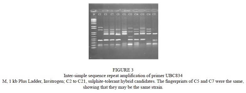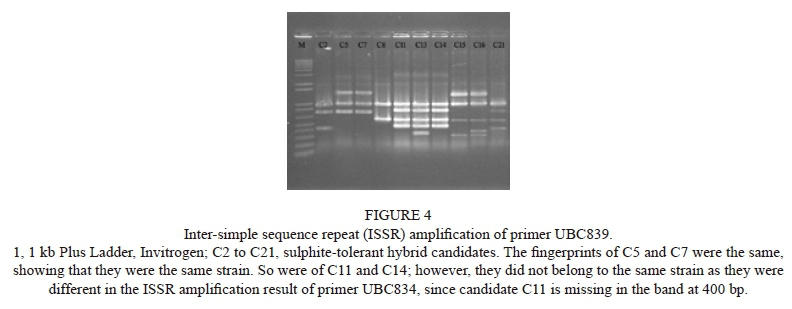 The results of PCR analysis with the FZF1 gene primer could indicate the authenticity of the hybrids, but were unable to distinguish whether the different single colonies belonged to the same strain. Because Saccharomyces has the ability to produce clonality, there was a possibility that different single colonies of the same strain existed (Zhang et at., 2010b). In this study, the ISSR technique was employed to genotype the ten offspring strains of S. uvarum showing the two bands. The results of the analysis of the ISSRs using six primers showed that there were 55 clear and reproducible bands, including 32 polymorphic bands, that were amplified by the six primers. Among the six primers, one primer, UBC834, could amplify products that could distinguish all the different strains except for C5 and C7 (from BC4xA9) (Fig. 3). Of the ten sulphite-tolerant candidate hybrid colonies, the fingerprints of C5 and C7 (from BC4xA9) amplified by six primers were completely consistent, and they were therefore assumed to represent the same strain (Table 1). The UBC839 fingerprints of C11 and C14 (from BZL10xA9) (shown in Fig. 4) were also identical, but they differed from the bands produced by other primers, e.g. UBC 834 (shown in Fig. 3), and indeed they were not identical strains. In total, nine different sulphite-tolerant hybrid strains were identified by ISSR.