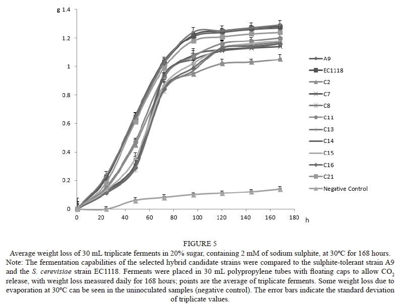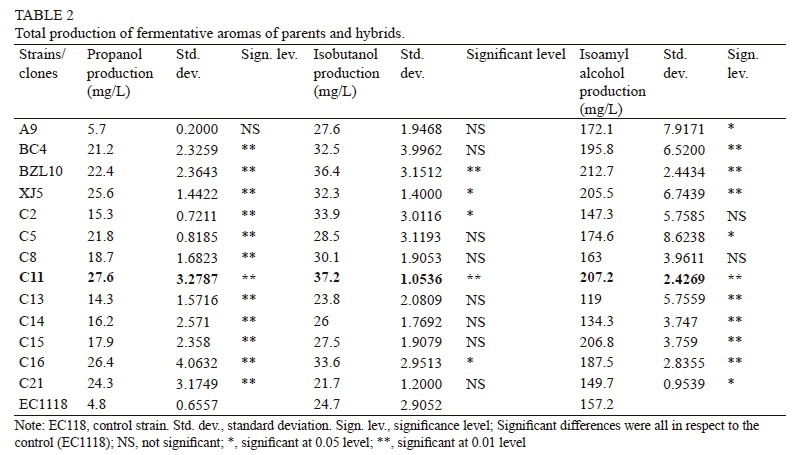 The medium and conditions are useful to study sulphite tolerance, but not to investigate the suitability of the hybrids for wine making, because S. uvarum are more cryotolerant than S. cerevisiae. Also, we demonstrated only the formation of three aroma compounds (higher alcohols) of the fermentation bouquet (Table 2), but other important aroma compounds like volatile thiols associated with Sauvignon blanc were not included. It is not representative and sufficient to compare the production of aroma compounds by parents and hybrids. Some hybrids had higher production of higher alcohols, although the sensory evaluation to confirm that wines also had improved aroma was not conducted. The suitability of the hybrids for wine production and the formation of metabolites should be studied in future research studies.