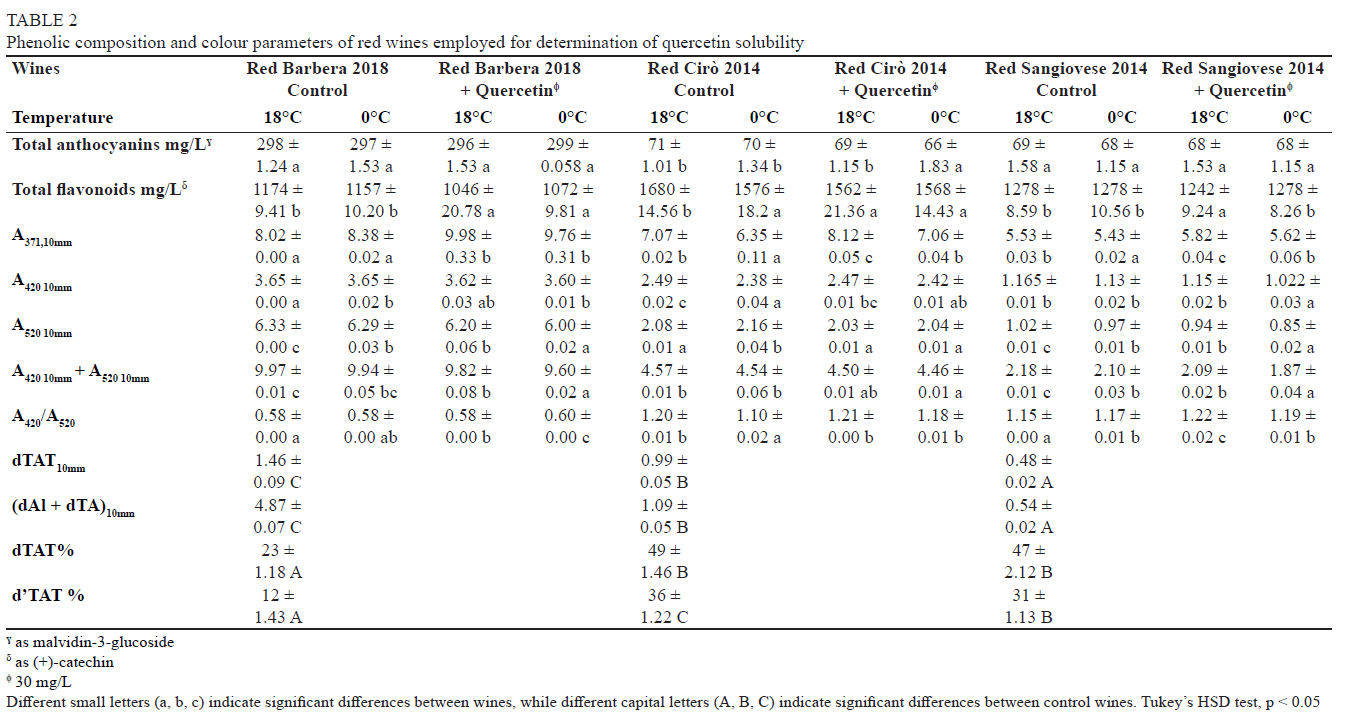 It is interesting to note that the addition of quercetin to Barbera, red Cirò and Sangiovese induced an increase in A371, but not in A520 (at 18°C and 0°C) compared to their respective controls (Table 2), unlike the expected hyperchro-mic effect induced by co-pigmentation complexes formation between pigments and solubilised quercetin. In contrast, a small decrease was found, probably due to co-precipitation