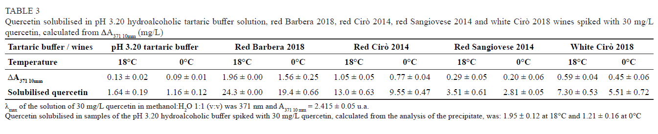 Starting from the A371, 10mm measured in the hydroalcoholic model solution, a quercetin solubility of 1.64 mg/L at 18°C and 1.16 mg/L at 0°C (Table 3) was calculated. The quercetin solubility found in this study for hydroalcoholic solutions seems to be in accord with that reported by Gambuti et al. (2020) for a similar solution to which 30 mg/L of quercetin had been added before being stored at 20°C for 15 days. Also, the solubilised quercetin in Barbera, red Cirò, Sangiovese and white Cirò was calculated using the values of ΔA371 10mm (Tables 2 and 3). Barbera treated solubilised 24.3 mg/L of quercetin (Table 3). If we add this value (24.3 mg/L) to the amount of quercetin already present in the control wine (3.5 mg/L, Table 4), the solubility of quercetin in this specific Barbera at 18°C becomes 27.8 mg/L. In the same wine, to which 30 mg/L quercetin has been added before storage at 0°C for three days, the solubilised quercetin was 19.4 mg/L. This decrease in quercetin content is the result of the relationship between the solubility of a solid and temperature.