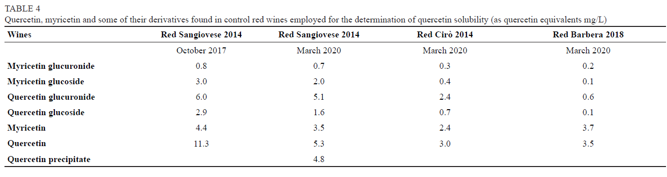 Three days after the spike of quercetin, all the samples showed a precipitate. Subsequently to the removal of these crystals, we analysed the model solution and wines, and these results are reported in Table 3.