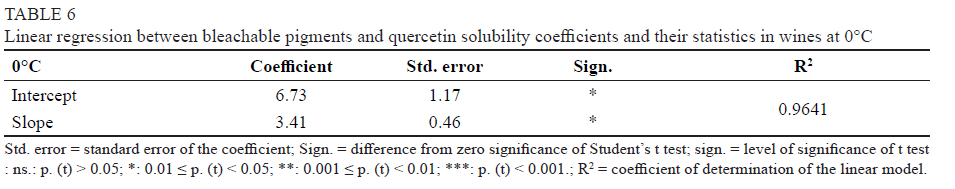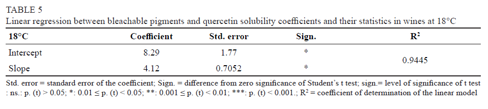 It can be seen from Fig. 1a and 1b and Table 5 and Table 6 that there is a significant positive linear relationship between the concentration of bleachable pigments (monomeric anthocyanins and small polymers of the colouring matter) and quercetin solubility in wines.