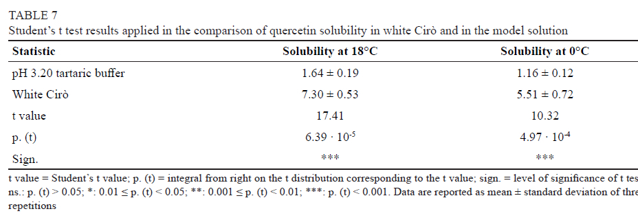 These differences are also strongly supported statistically by Student's t test (p (t) < 0.001). This indicates that there are other substances capable of increasing the solubility of quercetin in wines besides bleachable pigments.
