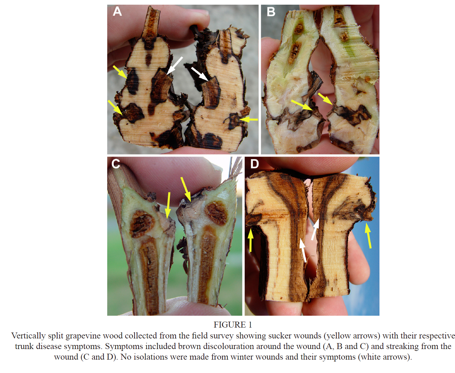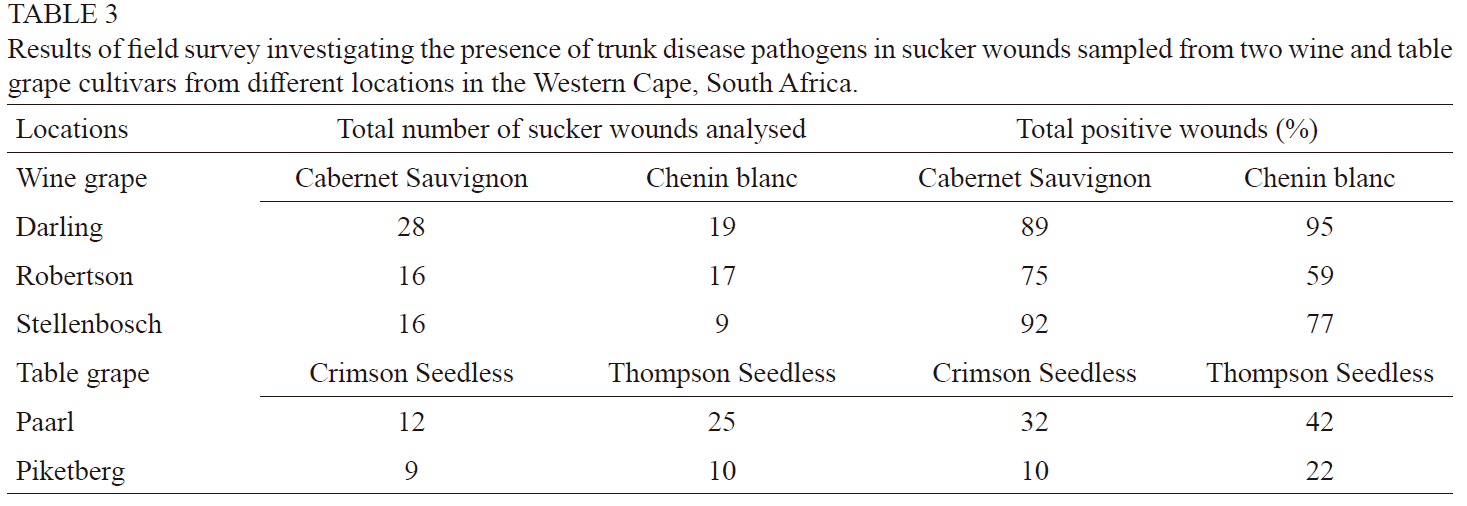 The natural susceptibility of sucker wounds to grapevine trunk disease pathogens reported in France and California, USA raises the question of the potential role of sucker wounds in trunk disease epidemiology. The objectives of this study were therefore to i) assess naturally infected sucker wounds from both wine and table grape vineyards in the Western Cape province of South Africa and ii) assess green shoot wound susceptibility towards different trunk disease pathogens.