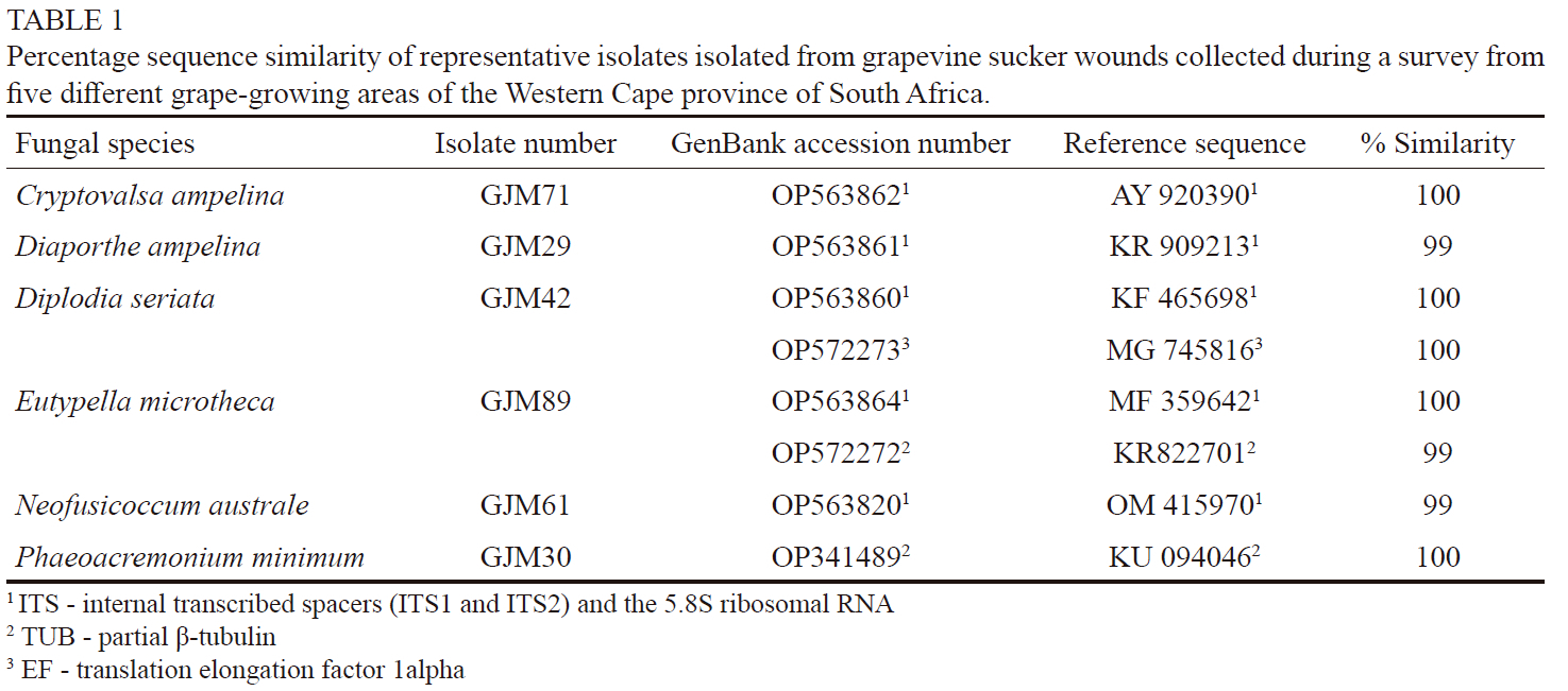 Vines from which sucker wounds were collected were selected randomly throughout the vineyard. Sucker wounds were cut (leaving approximately 2 cm of cane above and below the wound) from at least 10 of the cordons (table grapes) or spur bases (wine grapes) in each vineyard. Wounds that showed wood discolouration, which is typical of trunk disease infections, as well as symptomless wounds, were analysed further. In total, fungal isolations were made from 161 sucker wounds. Wood pieces were surface-disinfected in 70% ethanol for 30 seconds, then for one minute in 3.5% sodium hypochlorite solution and again in 70% ethanol for 30 seconds. Sucker wounds were aseptically dissected longitudinally across the wound. Fungal isolations were carried out aseptically from symptomatic (browning or streaking) wood that originated from sucker wounds, with wood fragments taken from the wound scar interface. In addition, if symptoms were not present, isolations were made from tissue from the interface that seemed healthy.