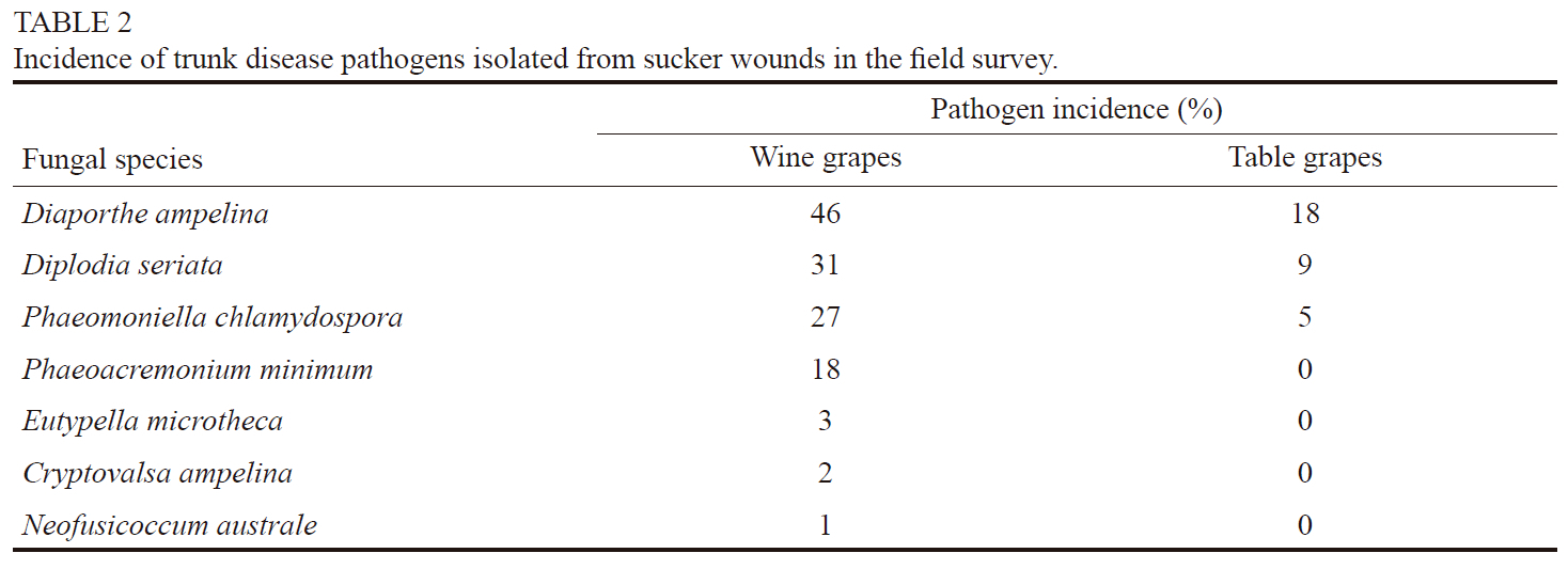 Sucker wounds of both wine and table grapevines were naturally infected by different trunk disease pathogens, including D. ampelina, D. seriata, P. chlamydospora, P. minimum, E. microtheca, C. ampelina and N. australe. Among these, D. ampelina, D. seriata, P. chlamydospora and P. minimum were the most commonly isolated species.