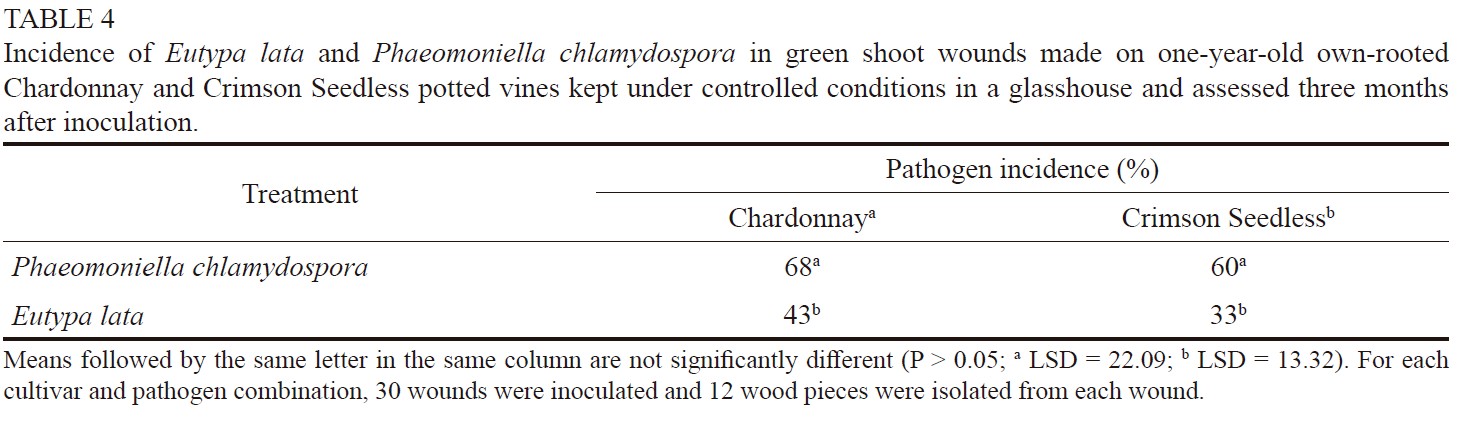 Green shoot wounds on potted Chardonnay and Crimson Seedless plants were susceptible to P. chlamydospora and E.lata. The analysis of variance did not reveal a significant cultivar × treatment interaction (P = 0.78), which indicates that both cultivars responded similarly to the two pathogens. For both Chardonnay and Crimson Seedless, significant differences were found between the pathogen treatments (P = 0.0009 for Chardonnay and P = 0.0001 for Crimson Seedless). The incidence of P. chlamydospora in inoculated green shoot wounds was significantly higher than that of E. lata in Chardonnay and Crimson Seedless (Table 4). No trunk disease pathogens were isolated from the controls. For the second trial, all of the inoculated fungi were re-isolated (Table 5). Significant differences were found between the pathogen treatments (P = 0.0018). Neofusicoccum parvum was isolated from 85% of the wounds, thus its occurrence was significantly higher than that of P. minimum (55%) and E. lata (45%). No trunk disease pathogens were re-isolated from the controls.