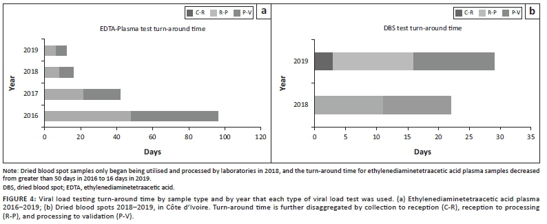 The VL dashboard was completed in June 2018 (Figure 2). In July 2018, initial pilot data from the dashboard were presented to Ministère de le Santé et de l'Hygiene Publique and donor stakeholders at a technical working group meeting for final dashboard approval. The website became publicly available in July 2018 (https://chargevirale.openelisci.org/vl_dashboard/), with an initial 10 VL testing laboratories successfully transmitting data to the dashboard via OE. The remaining seven laboratories started data sharing from January 2019, and retrospective data from October 2016-2018 were obtained, cleaned, and uploaded into the dashboard. The VL dashboard successfully reported data for all people living with HIV who received VL testing services in Côte d'Ivoire, with each unique test event recorded in the dashboard. Data from October 2016 to December 2019 indicated that a total of 622 500 samples were tested for VL, of which 452 896 (72.8%) samples were from women and 169 604 (27.2%) from men. Regional disaggregation of the data accounts for 616 812 VL tests, with the remaining 5688 tests having lost location traceability and are currently under investigation. Of the 616 812 traceable VL tests, the two Abidjan catchment areas accounted for 40.6% (n = 252 510) of the tests in the dashboard. Of the VL tests reported in the dashboard, 89.6% were from patients aged 25 years or older. Since the dashboard became active, the sample processing rate has increased, reflecting increased VL testing access and scale-up and increased test demand after national prioritisation in 2016 (Figure 3). Data from October 2016 to December 2019 indicate that 56.9% (354 184 tests) of people living with HIV receiving anti-retroviral therapy have viral suppression. People living with HIV aged 25 years or older had the highest suppression rate (79%), and paediatric and adolescent patients (aged 0-19 years) had the lowest rates. Paediatric (age < 10 years) viral suppression rates ranged from 47.6% to 56.9%. Adolescent (age 10-19 years) suppression rates ranged from 53.9% to 55.2%. Although the dashboard indicated that the national average turn-around time for ethylenediaminetetraacetic acid plasma samples decreased from more than 50 days to 16 days (Figure 4), this does not yet meet the national target of under 14 days. Viral load results obtained from tests performed on dried blood spots were introduced in 2018.