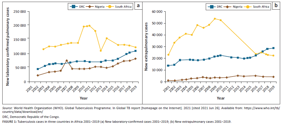 Confirmed PTB cases (Figure 1a)22 increased gradually from less than 50 000 cases in 2002 to slightly above 100 000 in the DRC and about 80 000 in Nigeria in 2019. However, in South Africa, tuberculosis cases peaked at about 200 000 in 2011, dropping to about 120 000 in 2019. New extrapulmonary cases (Figure 1b)22 followed a similar pattern to confirmed pulmonary cases but with much lower numbers; Nigeria showed a slight decline in the number of cases reported between 2017 and 2019.