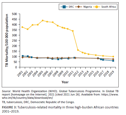 South Africa showed the most substantial decline in tuberculosis mortality per 100 000 population (Figure 3)22 from 2001 to 2019, with the steepest decline occurring between 2011 and 2012.