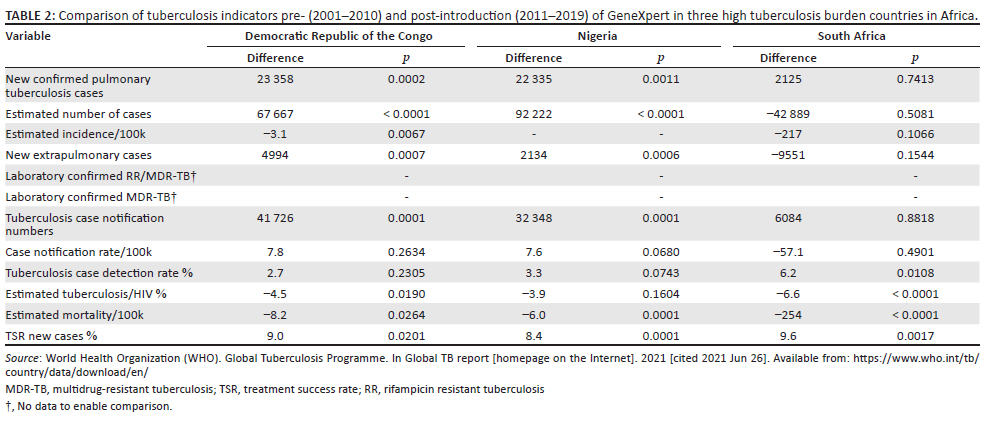 Our analysis showed that an increase in the number of diagnosed tuberculosis cases in the DRC and Nigeria was statistically significant, but the number of cases diagnosed in South Africa after the introduction of GeneXpert had decreased. Tuberculosis case notification rates and case detection rates did not show major changes. There was, however, a significant reduction in tuberculosis/HIV coinfection and mortality per 100 000 population, with an increase in treatment success rate for new cases in all three countries.