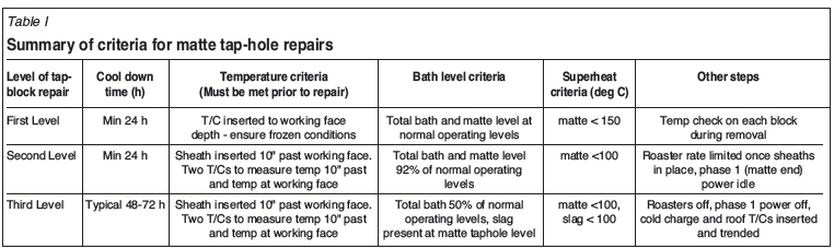 In the first two levels of repair, molten conditions still exist behind the frozen matte. In the highest level of repair, conducted during twice-annual shutdowns, the furnace level is reduced, cold charge material is added behind the tap-hole, and power is reduced to ensure frozen conditions behind all tap-holes on the matte endwall.