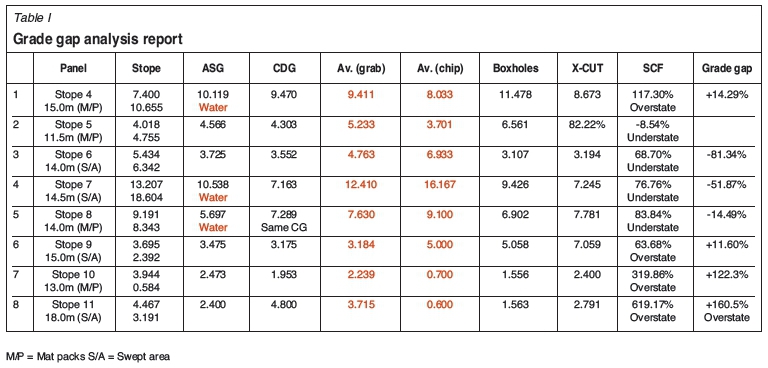 The blasted broken ore in the stopes is a mixture of waste rock and gold-bearing rock (reef). No matter how careful the personnel are to mine only reef, there will always be waste rock diluting the grade of ore going to the mill for processing. A gap analysis report of eight stope panels (Table I) was prepared to assist mine management understand why the ore tonnage and gold content were not being reflected further along the production stream.