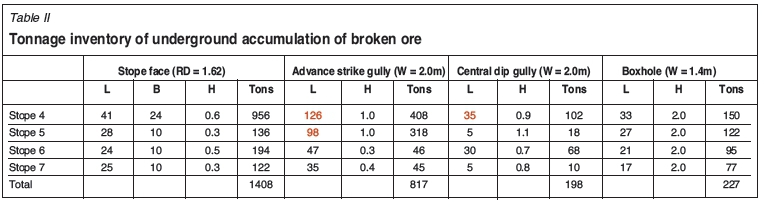 Table II indicates that there was accumulation of broken ore at the faces in stopes 4 and 5, gullies, and orepass during the movement of ore. The movement of ore in the stope is the result of blasting, face cleaning, gully scraping, and loading from the orepass. These are the potential areas of tonnage accumulation. The tonnage accumulations consist of current broken ore that is called for but was not removed in time to form part of the current metal accounting system. The inability to locate the exact points of accumulation of ore underground and quantify the volume and value of gold-bearing material remaining underground over time has led to a declining MCF.