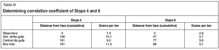 The current study was correlational in nature as it was designed to assist understanding of how gold was lost between the source (stope face) and the shaft main tips. The correlation coefficient is one of the techniques used to estimate reliability of this study by measuring the correlation between the distance from the source to the shaft and the gold content. The discussion above showed that the size distribution of fines was positively correlated and the coarse negatively correlated, but this is only a qualitative indication. The correlation coefficient provides a quantitative measure of the relationship. For example, the correlation coefficients for stopes 4 and 6 are presented in Table III and Figures 7 and 8.