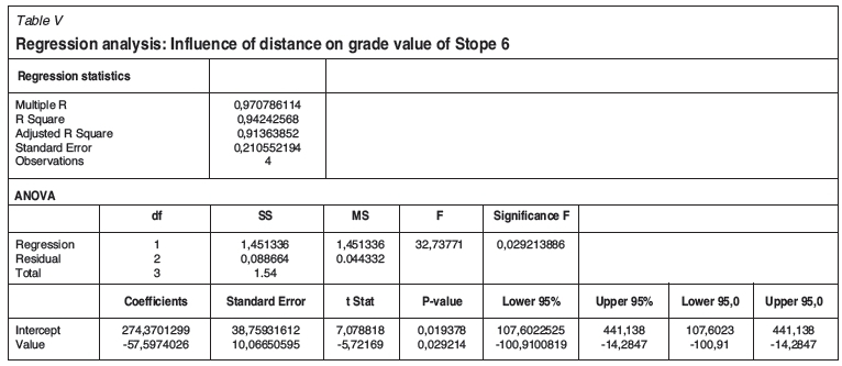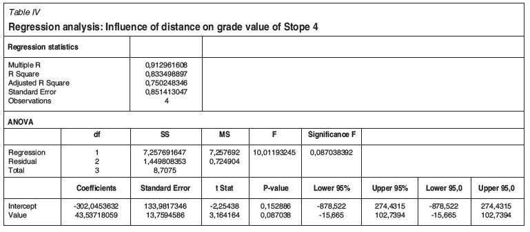 Regression analysis was performed to determine the extent to which the distance to the main shaft orepass would explain the variance in grams per ton (value) of the ore broken from the stope face. The discussion deals with the application of regression to firstly estimate or predict the quantitative effect of the distance upon the values, and secondly to determine the statistical significance of the estimated relationships. The summary of the Excel regression output is presented in Table IV (for the case where gold is evenly distributed over the width of the reef) and Table V (gold is concentrated near the footwall contact of the reef).