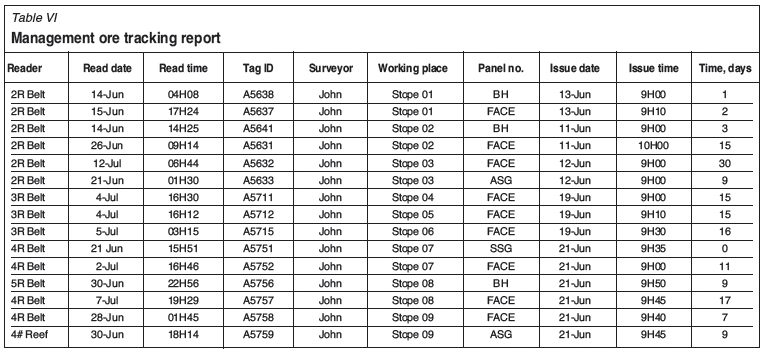 These numbered RFID tags have a chip with an antenna encased in a hard protective plastic shell to withstand the blasting and handling process en route to the mill plant. The tag number, the stope location where the tag was placed, the name of the surveyor, time and date, as well as shaft were entered into the database. The characteristics of the ore at the particular source were recorded in the field notebook underground. The RFID tags were dropped on the broken rock at the stope face and in the advance strike gully, centre gully, and boxhole. These tags surfaced from underground with broken ore on the conveyor belt, where a tag detector recorded and passed the information to the database. A management report was extracted from the database to assess the time taken for the waste and reef to reach surface. Tagged ore sent to stockpiles can be detected at a later stage when eventually processed and then reconciled back to its source.