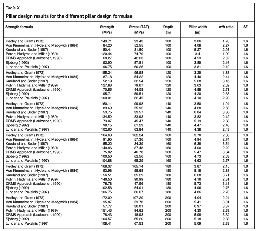 Since there is no straightforward way of calculating pillar width from the SF equation, several iterations were performed in Excel® to find the pillar width corresponding to a SF of 1.6 for each pillar strength formula. For the sake of clarity and brevity, the formulae presented earlier are not repeated here, but the values of the parameters as applied to the platinum exploration database are given and the results summarized in Table X. The parameters used in the pillar design exercise are as follows: mining height 1.8 m, pillar centres 18 m, rock density 2 700 kg/m3, UCS of intact pillar rock 152.3 MPa, and DRMS 48.4 MPa. The other parameter values for each of the formulae are as presented in Table I. The results of the pillar design exercise are summarized in Table X.