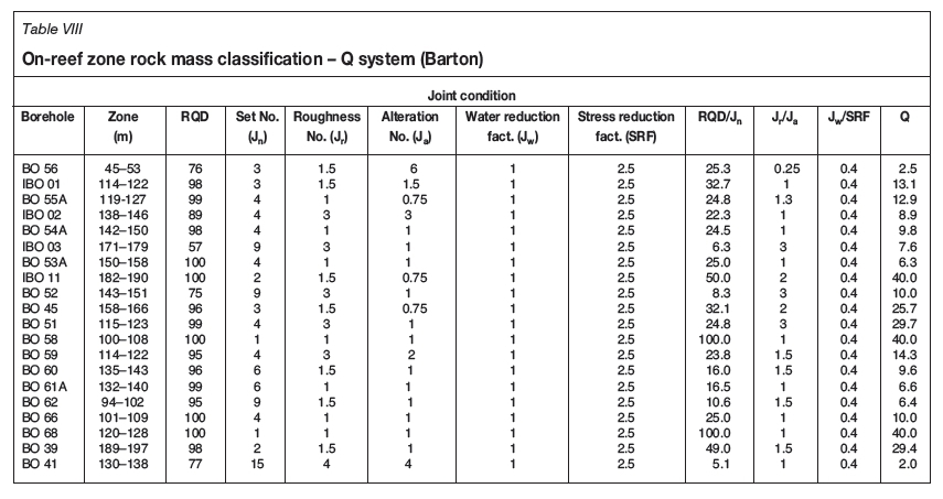 It was noted that results obtained using Equation [20] deviated from the Bieniawski RMR, so Equation [21] was used as it gave a closer correlation. Table IX gives the RMR values calculated from Q using Equation [21]. Table V gives the MRMR classification system results for the project.