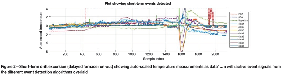 The second example is a short-term drift excursion (a delayed furnace run-out that occurred at some time after the temperature measurement excursion) of one of the temperature measurements on a copper cooler (excursion at sample index 443 and run-out at sample index 1550 as shown in Figure 2). In this instance, only the PCA-based technique was reliable in detecting the short-term drift excursion, with the Bayesian-based and SSA-based techniques detecting only the eventual run-out condition. As before, the Bayesian-based technique reported a few low-probability alarms, with the SSA-based technique being significantly slower in confirming the existence of an event compared to the other techniques.