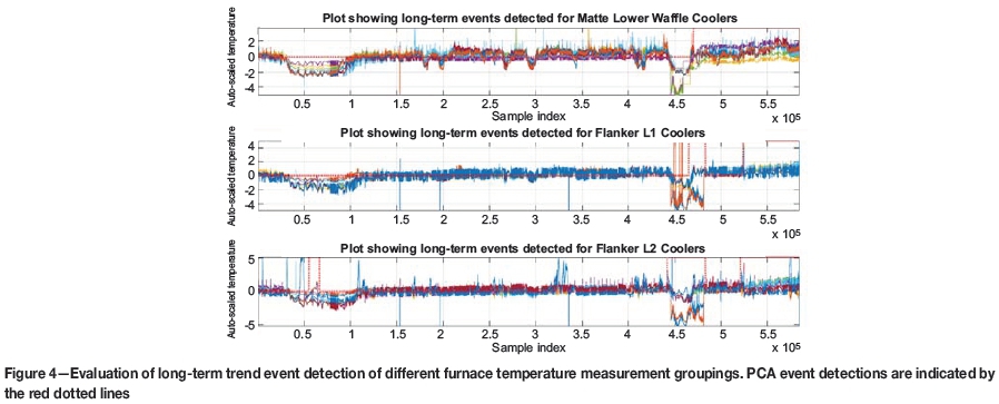 For the long-term trend event detection evaluation, furnace temperature measurement data from a few furnace temperature measurement groupings covering a period of approximately 6 months was considered (Figure 4). The data-set contains temperature measurements showing a distinct upward trend after a shutdown at approximately sample index 450 000, none of which were flagged by the standard operating warning and/or trip limits (as defined by the original equipment manufacturer), with a confirmed runout at approximately sample index 585 000. As with the data-sets used for the technique evaluation, inspection of the data indicated that the variables were not IID, and also not normally distributed. Despite this, the long-term trend event detection system was able to reliably detect the upward trend in the furnace temperature measurements for all three groupings. For the matte lower waffle coolers grouping, advance warning of rising furnace temperature measurements was given approximately 13 days prior to the run-out. The flanker L1 coolers and flanker L2 coolers groupings both gave approximately 6 days' advance warning. The PCA-based long-term trend event detection system was found to be sufficiently sensitive to reliably detect long-term upward trends in furnace temperature measurements.