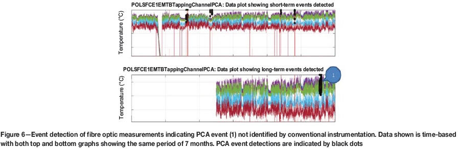 In terms of further technology development, event detection was also utilized with the newly-installed fibre optic technology, which would enable spatial monitoring of the tap-hole. Fibre optic technology has significantly increased the amount of sensors compared to the standard instrumentation on the tap-block (Hopf and Rossouw, 2006; Gerritsen et al., 2009; Hopf, 2014; Braun et al, 2014; MacRosty, Gerritsen, and Pula., 2014; Ying et al., 2015; Sadri et al., 2016). It was therefore beneficial to use PCA on the fibre optic temperature data. This proved fruitful in that the analysis of fibre optic temperature data in one instance gave indications of a PCA event that was not detected by the conventional thermocouples, which may indicate a variation in the freeze lining or tapping (Figure 6). However, it should be equally noted that in another instance, the conventional temperature monitoring identified an event that was not identified through PCA analysis of fibre optic temperature data. A possible reason for this could be that the fibre optic temperature data at that point reflected the temperature over a specific sensor length, rather than at a specific point as with the conventional thermocouple monitoring.