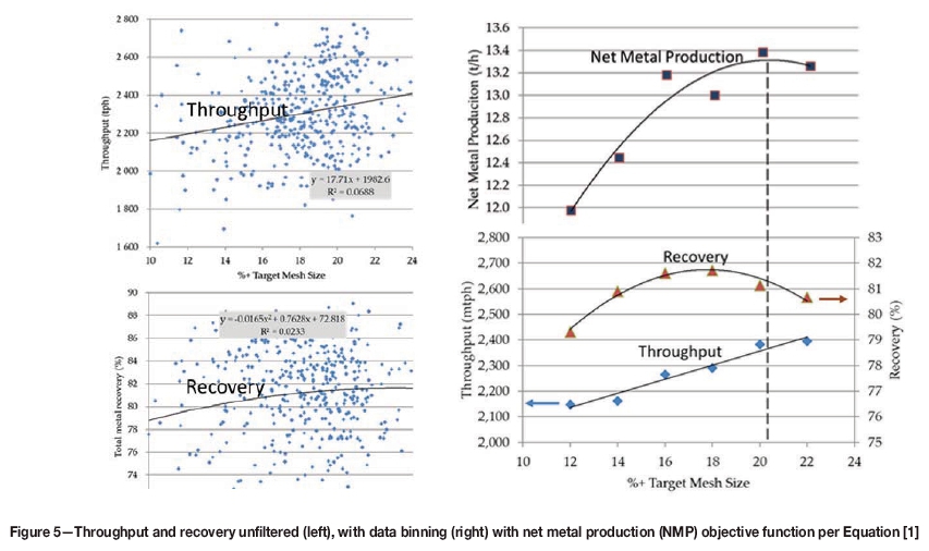 The filtered throughput and recovery are then verified; i.e., throughput should show an increasing tendency with increasing particle size, and recovery should show a peak at a unique particle size, both as predicted by basic comminution and flotation practice. NMP can now be calculated, and its maximum identified as shown in Figure 5 (right).