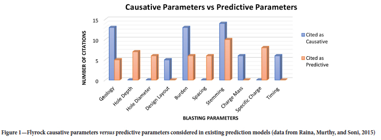 An initial literature review concluded that existing predictive models may not be sufficient to constitute a global technique that can be considered during the blast design process (van der Walt and Spiteri, 2020). The multiple studies reviewed and analysed concluded that 'there are major research gaps into the phenomena of flyrock and that this concept is not well understood' (Raina, Murthy, and Soni, 2015). The biggest concern is the inconsistent parameters used in various prediction models and the estimated impact of these parameters on the model's output. Using the data presented by Raina, Murthy, and Soni (2015), the theoretically causative factors of flyrock are compared to the factors taken into account in the predictive models and equations (Figure 1).