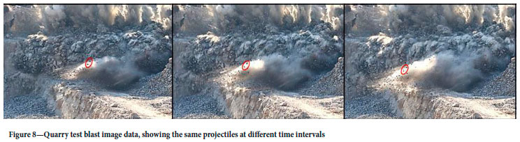 The image processing and data analysis phase includes the identification of critical projectiles in the captured images and measuring the positions (x-, y-, and z-coordinates) at different points in time using photogrammetric software. The positional measurements are highly dependent on the on-site calibration of the cameras' lenses on the day of the blast.